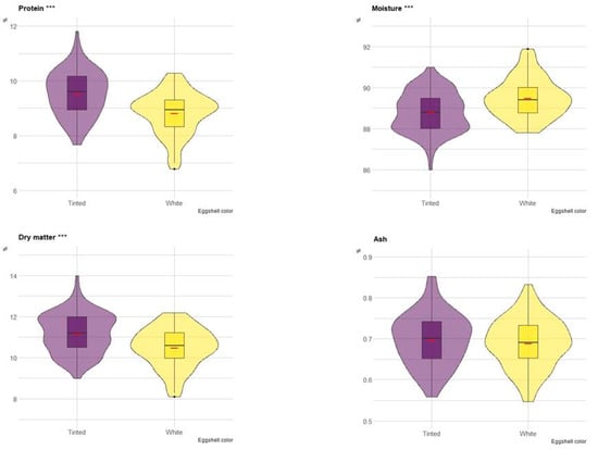 Differences in composition between white eggshell (PA-C, PA-G, PO-W, PO-B) and tinted eggshell breeds (ER, RM, RL, PP) were investigated. Figure 2 depicts boxplots with the comparison of protein, moisture, dry matter and ash of albumen between the two groups. The violin plot has been integrated into boxplots to show the data distribution. Protein content and dry matter were greater in eggs with tinted shells (p < 0.001), whereas moisture content was greater in eggs with white shells (p < 0.001). Ash content did not differ between the two groups (Figure 2).