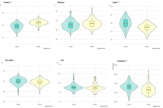 Figure 3 depicts the boxplots of the yolk content of eggs with white and tinted shells. In particular, lipid content (p < 0.001) and cholesterol content (p < 0.01) were greater in eggs with tinted than white shells. Conversely, the protein content was significantly greater in eggs with white than tinted shells. Moisture, dry matter and ash did not differ between the two groups (Figure 3).