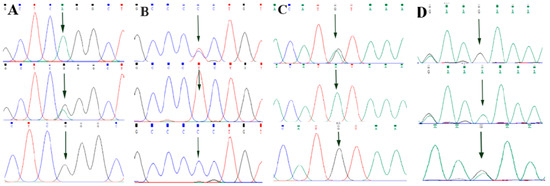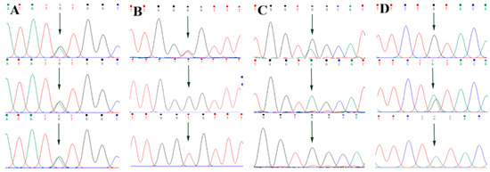 20 DNA samples were randomly selected for each pair of primers for PCR amplification, and the successfully amplified products were sent to Qingke Biological Company (Nanjing, China) for sequencing. The sequencing results were compared with Vector NTI Advance 11 software to find out the mutation sites and their specific positions. The amplification procedure was as follows: pre-denaturation at 94 °C for 5 min, denaturation at 94 °C for 30 s, renaturation at 68 °C for 30 s, and extension at 72 °C for 2 min 10 s, 17 cycles. Denaturation at 94 °C for 30 s, renaturation at 51 °C for 30 s, and extension at 72 °C for 2 min 10 s, 20 cycles. The final extension was at 72 °C for 10 min and stored at 4 °C.