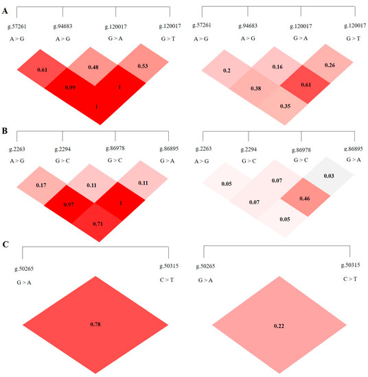 - Shi, Y.Y.; Lin, H.E. SHEsis, a powerful software platform for analyses of linkage disequilibrium, haplotype construction, and genetic association at polymorphism loci. Cell Res. 2005, 15, 97–108. [Google Scholar] [CrossRef]