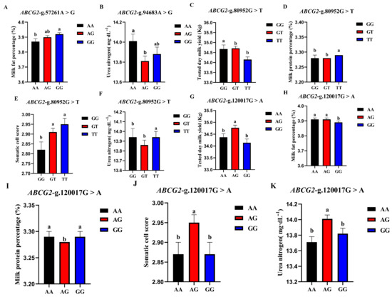 Effect of different genotypes in ABCG2 four SNP loci on production traits in Chinese Holstein cattle. (A) The milk fat percentage of GG-type cows in the ABCG2-g.57261A > G locus was significantly higher than that of AA-type and AG-type cows. (B) ABCG2-g.94683A > G locus had significantly higher urea nitrogen content in the milk of AA type cows than AG and GG types. In ABCG2-g.80952G > T locus, the tested day milk yield (C) of TT type cows was significantly lower than that of GG and GT type cows; somatic cell score (D), milk protein percentage (E), and urea nitrogen (F) of TT type cows were significantly higher than GG and GT types. In ABCG2-g.120017G > A locus, AA type cows tested day milk yield (G) was significantly higher than that of AG and GG type cows, and the milk protein percentage (H), milk fat percentage (I), somatic cell score (J) and urea nitrogen (K) of AG type cows were significantly higher than those of AA and GG type cows. Data in the same column with different lowercase letters on the shoulder indicate significant differences (p < 0.05).