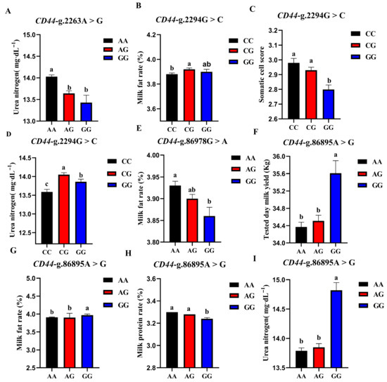 Effect of different genotypes in CD44 four SNP loci on production traits in Chinese Holstein cattle. In CD44-g.2263A > G locus, AA type urea nitrogen content of was significantly higher than that of AG and GG genotypes (A). In CD44-g.2294G > C locus, milk fat percentage (B) and milk urea nitrogen content of CG-type (D) cows were significantly higher than CC and CG types. Higher SCS for CC- and CG-type cows (C). In CD44-g.86978G > A locus, Type AA cows have the highest milk fat percentage (E). In CD44-g.86895A > G locus, tested day milk yield (F), milk fat rate (G), and milk urea nitrogen content (I) of GG-type cows were significantly higher than those of AA, AG types; AA and AG cows had the highest protein rates (H). Data in the same column with different lowercase letters on the shoulder indicate significant differences (p < 0.05).