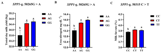 SPP1-g.50265G > A and SPP1-g.50315C > T loci on the productive performance of different genotypes. tested day milk yield (A) and milk urea nitrogen content (C) were significantly higher in AG and GG types of cows than in AA-type; CT and TT types of cows were significantly higher than the CC-type, milk fat rate (B) of CT and TT types were significantly higher than that of CC-type. Data in the same column with different lowercase letters on the shoulder indicate significant differences (p < 0.05).