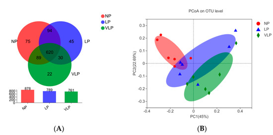 (A) Effects of different protein diets on colon microflora OTU of finishing pigs. (B) Principal coordinates analysis (PCoA) of microbial composition in the colon of growing pigs (based on the bary_curtis distance). The individual pig was regarded as the experimental unit (n = 6). NP, normal protein; LP, low protein; VLP, very low protein.