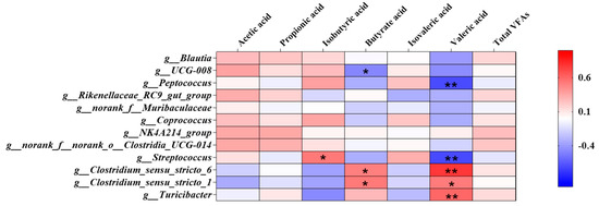 The correlation between the top 12 genera and the concentration of SCFAs content in colon is shown in Figure 5, wherein the bacteria including Turicibacter, Clostridium_sensu_stricto_6, Blautia, UCG-008 Clostridium_sensu_stricto_1, Peptococcus, Coprococcus, NK4A214_group, Streptococcus, Muribaculaceae, Rikenellaceae_RC9_gut_group and Clostridia_UCG-014. Turicibacter and Clostridium_sensu_stricto_6 had a very significant negative correlation with the content of valeric acid (p < 0.01), while Peptococcus and Clostridia_UCG-014 had a very solid positive correlation (p < 0.01).