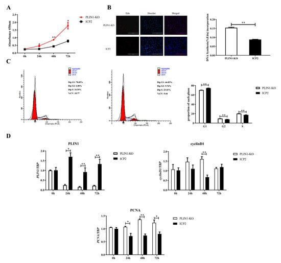 Knockout of PLIN1 promotes the proliferation of chicken preadipocytes. Twelve hours after inoculation, cell proliferation was recorded as 0 h. (A): Effect of PLIN1 knockout on chicken preadipocyte proliferation rate. (B): Effect of PLIN1 knockout on chicken preadipocyte DNA synthesis. (C): Effect of PLIN1 knockout on the chicken preadipocyte cycle. (D): Effect of PLIN1 knockout on the mRNA expression of cell proliferation marker genes. All data are representative of three independent experiments and are shown as the means ± SDs (* p < 0.05, ** p < 0.01).