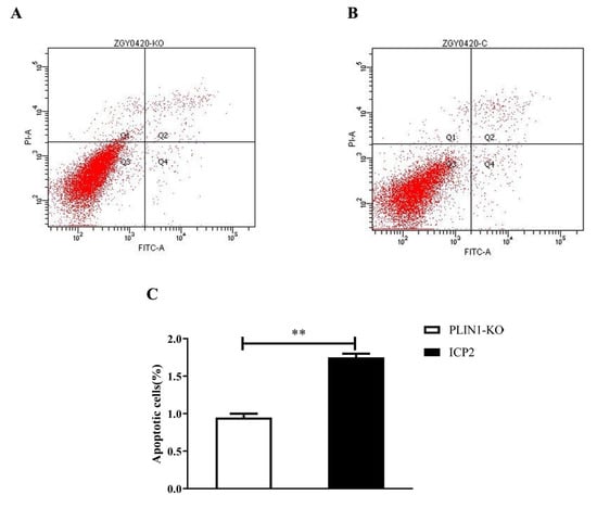 To detect the effect of PLIN1 knockout on chicken preadipocyte apoptosis, an annexin V-FITC staining assay was performed. The results showed that when the cells proliferated for 48 h, the proportion of apoptotic cells in the PLIN1-KO cells was extremely significantly reduced compared with that in the ICP2 cells (p < 0.0 l, Figure 3C), indicating that PLIN1 very significantly promotes the apoptosis of chicken preadipocytes.