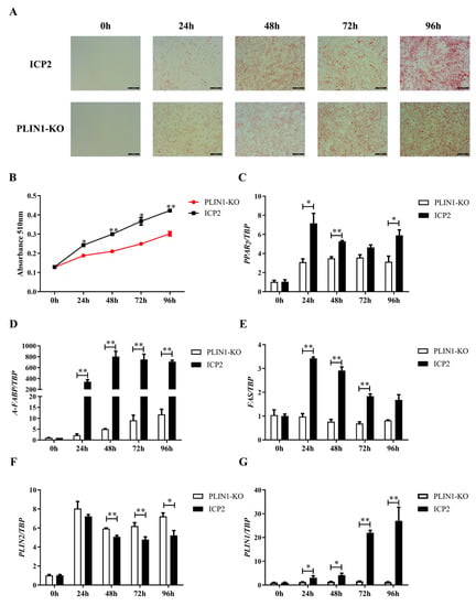 Knockout of PLIN1 inhibited the differentiation of chicken preadipocytes. (A,B): Comparison of LD accumulation during preadipocyte differentiation between ICP2 cells and PLIN1-KO cells. (A): Oil red O staining (200 μM). (B): Oil red O extraction. (C–G): Effect of PLIN1 gene knockout on the expression of preadipocyte differentiation marker genes. (C): PPARγ gene; (D): A-FABP gene; (E): FAS gene; (F): PLIN2 gene; (G): PLIN1 gene. All data are representative of 3 independent experiments and are shown as the means ± SDs (* p < 0.05, ** p <0.01).