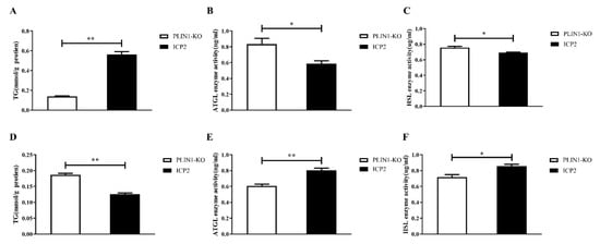 To explore the effect of PLIN1 knockout on the lipolysis of chicken preadipocytes, we compared the differences in TG content and HSL and ATGL activity in PLIN1-KO and ICP2 cells under basal and hormone-stimulated conditions. Under basal conditions, after differentiation for 24 h, the TG content in PLIN1-KO cells was significantly lower than that in ICP2 cells (p < 0.01, Figure 5A), and the ATGL and HSL activities in PLIN1-KO cells were significantly higher than those in ICP2 cells (p < 0.05 or p < 0.01, Figure 5B,C). Under isoproterenol stimulation for 6 h after differentiation for 24 h, the TG content in PLIN1-KO cells was significantly higher than that in ICP2 cells (p < 0.01, Figure 5D), and the ATGL and HSL activities in PLIN1-KO cells were significantly lower than those in ICP2 cells (p < 0.01, Figure 5E,F). These results provide evidence that PLIN1 inhibits the lipolysis of chicken adipocytes under basal conditions and promotes the lipolysis of chicken adipocytes under hormone stimulation.