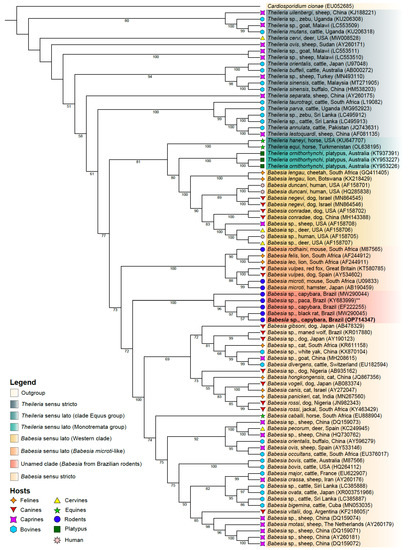 - Schnittger, L.; Ganzinelli, S.; Bhoora, R.; Omondi, D.; Nijhof, A.M.; Florin-Christensen, M. The Piroplasmida Babesia, Cytauxzoon, and Theileria in farm and companion animals: Species compilation, molecular phylogeny, and evolutionary insights. Parasitol. Res. 2022, 121, 1207–1245. [Google Scholar] [CrossRef]