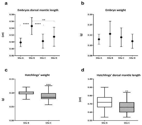 Considering the dorsal mantle length of embryos between the 28 and 29 stages, values from site A, site C, and site D were significantly lower (p ≤ 0.0001, p ≤ 0.0001, and p ≤ 0.01, respectively) than those from site B (Figure 1a). Embryo average weight appeared the highest in site B with respect to the other sampling sites, however, the differences among embryo weights were not significant (p > 0.05) due to the high variability of samples analyzed (Figure 1b). The comparison between hatchling weight and mantle length highlighted significantly lower values (p ≤ 0.001 and p ≤ 0.01, respectively) in animals from site C compared to hatchlings from site B (Figure 1c,d).