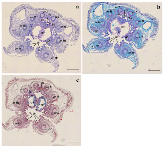 Example of transversal sections of the anterior part at the buccal mass level of S. officinalis representative of both embryos at the 28–29 development stages and hatchlings from all sampling sites, stained with (a) Haematoxylin-eosin stain; (b) Alcian blue stain; (c) Masson’s trichrome stain. ar I-IV, arm I-IV; ays, anterior yolk sac; bk, beak; bv, blood vessel; ra, radula; sk, suckers; tc, tentacle. Scale bar: 500 µm.