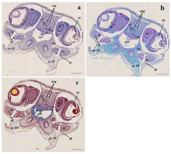 Example of transversal sections of the anterior part at the visual system level of S. officinalis representative of both embryos at the 28–29 development stages and hatchlings, from all sampling sites, stained with Haematoxylin-eosin stain (a); Alcian blue stain (b); Masson’s trichrome stain (c). ar IV, arm IV; asg, anterior salivary gland; ays, anterior yolk sac; bv, blood vessel; ey, eye; le, lens; ol, optical lobe; ra, radula; rc, radula cartilage; re, retina; sk, sucker; tc, tentacle; tp, tentacular pocket. Scale bar: 500 µm.