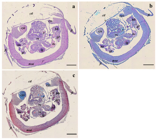 Example of transversal sections of the central part at the visceral sac level of S. officinalis representative of both embryos at the 28–29 development stages and hatchlings, from all sampling sites, stained with Haematoxylin-eosin stain (a), Alcian blue stain (b), and Masson’s trichrome stain (c). Bh, branchial heart; bv, blood vessel; ctl, cuttlebone; cys, central yolk sac; fi, fins; gl, gills; ig, ink gland; mnt, mantle; vs, visceral sac; y, yolk. Scale bar: 500 µm.
