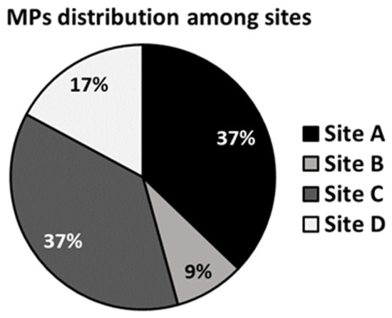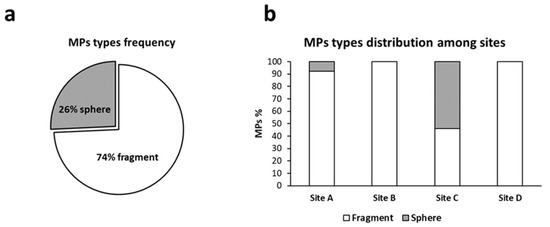 The sites with the highest number of MPs were Site A and C which both represented 37% of the total amount (Figure 6). Only two MP types were detected among all the samples observed: fragments, corresponding to most MPs (74%), and spheres (26%) (Figure 7a). MP fragments and spheres were observed only in sites A and C, whereas in sites B and site D only MP fragments were detected (Figure 7b).