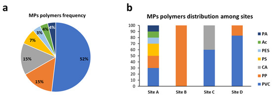 (a) Percentage frequency of MP polymers and their distribution (b) among sampling sites. PVC, polyvinyl chloride; PP, polypropylene; CA, cellulose acetate; PS, polystyrene; PES, polyethersulfone; AC, acrylic; PA, polyamide. Site A = Senigallia; site B = Ancona; site C = Numana; site D = San Benedetto del Tronto.