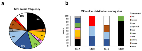 Percentage frequency of MP colors (a) and color distribution among sampling sites (b).