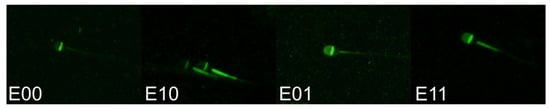 Class E00: non-phosphorylated sperm; class E10: spermatozoa showing tail protein tyrosine phosphorylation (midpiece or midpiece and additional fluorescence in endpiece); class E01: spermatozoa showing head protein tyrosine phosphorylation but without phosphorylation in the tail region; class E11: sperm with fluorescence in tail and head compartments [].