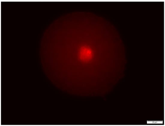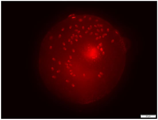Zona binding assay results are shown in Table 4. The sperm-binding capacity of the oocytes in both groups (control and 0.5 mg of CLC addition) differed between the replicates with a p-value in the control group of p < 0.001 and with a p-value in the group with CLC of p < 0.001. Significantly more spermatozoa bound to the zona pellucida when using extender without addition (control) than when 0.5 mg of CLC was used, at p < 0.001 (Table 4). In both groups, there were oocytes without any bound spermatozoa (Figure 2) and some with many spermatozoa attached (Figure 3).