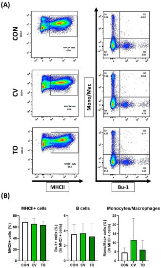 Supplementary Figure S1). In panel one, MHCII+ cells were first identified, and then the population of B cells and Monocytes/Macrophages were confirmed using Bu-1 (B cell marker) and Mono/Mac (Monocytes/Macrophage marker). No significant differences in subpopulations of the B cells or monocytes/macrophages caused by dietary microalgae (