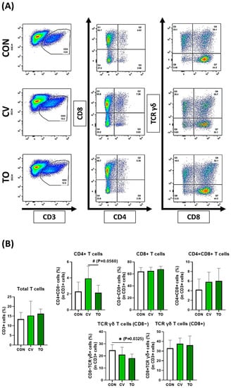 Figure 1) were noted. In panel two, T cells were mainly analyzed. After checking the total T cells (CD3+ cells), various T cell subsets were compared through CD4 and CD8 combinations and TCR γδ and CD8 combinations. The CD3+ T cells tended to increase in CV- and TO-fed laying hens compared with the control group; however, statistical significance was not found (