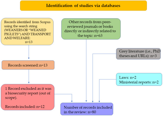 The literature search was performed using Scopus® database (www.scopus.com) in November 2022 and then repeated in February 2023. The used search terms were (WEANERS OR “WEANED PIGLETS”) AND TRANSPORT AND WELFARE. Given the limited number of articles being found (only 13 peer-reviewed publications), no limitation was set in the time span of the search. Grey literature was also searched using Google Scholar database based on the same search terms. An additional assessment of bibliographical items resulted in further identification of relevant sources of information, which were then included among the list of documents of interest. The bibliographic material—mostly peer-reviewed resources and in some instances government publications—was restricted to primarily English language and non-English publications which included an English abstract, where relevant information could be retrieved. Once relevant publications were identified, they were filed and categorized for further evaluation. Figure 1 shows the number of studies and documents found and retained at each step of the literature review process.