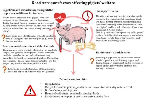 The purpose of this review is to present the best available scientific knowledge on key effects of pre-transport and transport factors influencing the response of piglets to transport stress and post-transport recovery. To date, research on piglet transportation particularly focused on the effects of season (i.e., heat and cold stress), vehicle design features (ventilation type and deck/compartment location), space allowance and transport duration, and piglet genetics. More specifically, in this review the effect of transport duration has been dealt with through its impact on death rate, behaviour and physiological response, and feeling of hunger and thirst. Based on the available literature, clear conclusions can be drawn on the vulnerability of piglets to heat stress during transport. Both short and long transportation have an effect on piglet welfare, with effects being biased by the genetic background, ambient conditions and vehicle design. Further studies investigating the impact of factors such as vehicle design, truck stocking density and environment, piglet genetic background, and weaning age are needed.