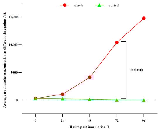 Statistics of the trophozoite concentrations of B. coli at various time points. The culture media of T (with starch) and N (without starch) groups were inoculated with 300 trophozoites. At 0, 24, 48, 72, 96 h post-inoculation, trophozoites were counted under a microscope using the limiting dilution method. Statistical analysis was performed using the one-way ANOVA and significant difference was observed between the T and N groups at 72 h (****: p < 0.0001). The concentration at 0 h post inoculation was 100 cells/mL, the average concentration at 72 h in T group was 10,400 cells/mL, and the average trophozoite concentration at 72 h in N group was 30 cells/mL. The average trophozoite concentration was calculated based on three biological replicates.