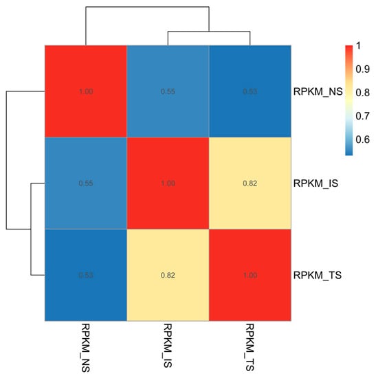 A total of 22.27 G clean data were generated in this study. As shown in Table S2, the percentage of clean reads of the three subgroups IS, TS, and NS after filtering were 92.63%, 93.61%, and 87.32%, respectively. The proportions of Q20 for three subgroups reached 89.04−93.69%, and those of Q30 were more than 86.70%. In addition, GC content was 30% on average. The mapped percentages of transcriptome comparison were calculated as 68.2–76.1% in the three subgroups.