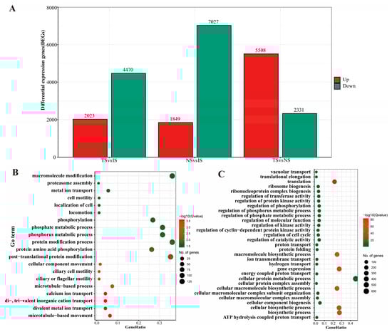 Statistics of differentially expressed genes and their GO functional enrichment analysis. (A): Statistics of differentially expressed genes among different comparison sets. (B,C): GO functional enrichment analysis of DEGs for the biological process (BP) in TS vs. IS and TS vs. NS sets, respectively. GeneRatio represents the ratio of the number of identified genes to the number of total genes annotated in the individual term.