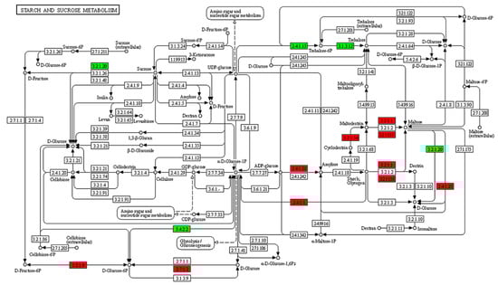 KEGG pathway analysis of starch and sucrose metabolism in B. coli based on the DEGs of the set TS vs. NS. The red and green colors represent the up- and downregulations of genes involved in the pathways of starch and sucrose metabolism, respectively. The genes related to alpha amylase, maltogenic alpha-amylase, and 4-alpha-glucanotransferase were upregulated in expression in the hydrolyzation of starch in B. coli.