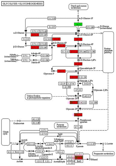 KEGG pathway analysis of glycolysis in B. coli based on the DEGs of the set TS vs. NS. The red and green colors represent the up- and downregulations of genes involved in the glycolysis pathway. The genes related to glucokinase, glycogen phosphorylase, glucose-6-phosphate isomerase, and 6-phosphofructokinase were upregulated in expression in the glycolysis pathway of B. coli.