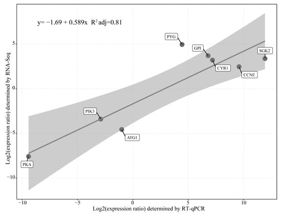 To verify the GO and KEGG enrichment analysis, eight key genes were chosen for further RT-qPCR testing (Figure 7). Those genes were distributed in hydrolysis of starch, glycolysis, cAMP signaling pathway, cell cycle, and autophagy of cells. The results showed that the DEGs obtained by RT-qPCR and RNA-seq analysis had a very high correlation (R2 = 0.86). Meanwhile, the comparative bar plot for corresponding genes expression of the two methods were shown in detail (Figure S8), the standard deviation was calculated form the three biological replicates. The results demonstrated that the data of differential gene expression of B. coli under the action of starch based on transcriptomic analysis were reliable in this experiment.