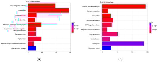 KEGG enrichment analysis of expanding (A) and specific (B) gene families of B. coli. The genes related to endocytosis, salivary secretion, pancreatic secretion, calcium signaling pathway, and the cAMP signaling pathway were significantly enriched in B. coli. In the histogram, the horizontal coordinate is the number of genes under this pathway, and the bar colors represent the corresponding p values; a lower p value refers to more significant enrichment.