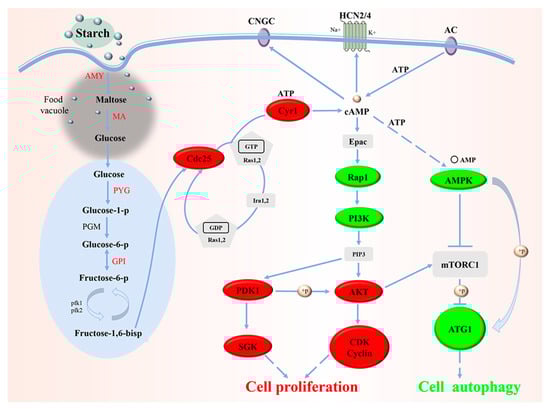 cAMP depends on AKT in regulating autophagy. The PI3K/AKT/mTOR signaling pathway has been demonstrated to be the main pathway for cells to regulate autophagy [,,,]. mTORC1 is directly involved in the regulation of some major cellular autophagy proteins, and its upstream regulatory factor is PI3K/AKT, which can integrate signal pathways from the cellular environment and eventually regulate autophagy []. Studies have shown that phosphorylation of AMPK directly activates ATG1 in glucose deficiency, thereby promoting autophagy []. When nutrients are sufficient, the expression of AMPK is reduced, and its inhibitory effect on the phosphorylation of mTORC1 is weakened []. However, the activated mTORC1 by a high level of AKT disrupts the interaction between AMPK and ATG1, preventing the activation of ATG1, thereby suppressing autophagy []. In this study, PI3K, AMPK, and ATG1 genes regulating cell autophagy were downregulated, while AKT was upregulated in B. coli at 72 h post starch treatment. These regulatory factors were engaged in the suppression of autophagy of the trophozoites.