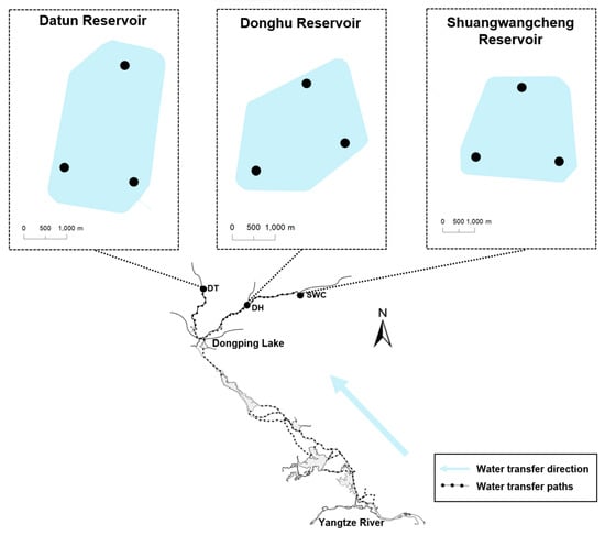 This study was carried out at three reservoirs located along the eastern route of the South-to-North Water Transfer Project (SNWTP), namely (1) Datun (DT), (2) Donghu (DH), and (3) Shuangwangcheng (SWC). These reservoirs were commissioned in 2013 and primarily receive water diverted from Dongping Lake. These storage reservoirs are similar in terms of acreage, operational storage capacity, and structural design (Figure 1). Specifically, the acreages and operational storage capacities of DT, DH, and SWC are, respectively, 5.1, 4.4, and 6.4 km2 and, respectively, 4.46, 4.70, and 5.32 billion m3. Every reservoir has one inlet for receiving the diverted water and two outlets for water supply to the recipient regions. DH and SWC share an identical pathway of water diversion, with a straight distance of approximately 130 and 257 km from Dongping Lake, respectively. DT is located on another pathway, with a straight distance of approximately 130 km from the lake (Figure 1).