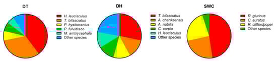 When considering each reservoir individually, 18, 18, and 17 species were detected in DT, DH, and SWC, respectively (Table 1). Herbivorous and planktivorous fish were less frequent in all reservoirs. For instance, only one herbivorous and four planktivorous species were detected in DT and DH, respectively. Carnivorous species were the most frequent, accounting for 44.44%, 38.89%, and 41.18% of the total species in DT, DH, and SWC, respectively. Demersal and small fish were the major components of assemblage structures in all reservoirs. Demersal fish accounted for 50.00%, 55.56%, and 52.94% and small fish for 66.67%, 72.22%, and 70.59% of the total number in DT, DH, and SWC, respectively (Table 1). Based on the relative abundance, five, five, and three dominant species were identified in DT, DH, and SWC (Figure 2). Most of the dominant species, such as T. bifasciatus, Hemiculter leucisculus, and Rhinogobius giurinus, were small fish, accounting for 85.30%, 53.52%, and 94.97% of the total number of identified fish in DT, DH, and SWC.
