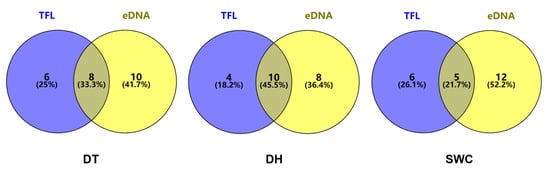 In individual reservoirs, 24, 22 and 23 species were collectively detected using the two methods in DT, DH and SWC, respectively (Figure 3). The concordance of species detected simultaneously of eDNA with TFL varied between 21.7 and 45.5% in the three reservoirs. In general, the number of species uniquely detected by eDNA metabarcoding was higher than that uniquely detected by TFL. For instance, 41.70%, 36.40%, and 52.20% of the species were only detected by eDNA metabarcoding in DT, DH, and SWC (Figure 3). The dominant species detected by either method were similar among the reservoirs, except for SWC (Figure 4). In DT and DH, small fish such as H. leucisculus, T. bifasciatus, and Acheilognathus macropterus were the dominant species (Figure 4).
