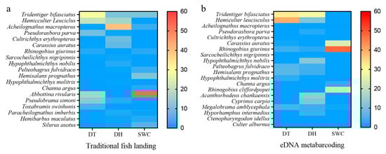Heat maps of the relative abundance of each species in Datun (DT), Donghu (DH), and Shuangwangcheng (SWC) reservoirs detected by traditional fish landing (TFL, (a)) and environmental DNA (eDNA, (b)) metabarcoding.