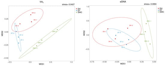 Overall, the two methods revealed a consistent variability pattern in the three reservoirs, and the calculated diversity indices were the highest in DT and the lowest in SWC (Table 3). The Shannon–Wiener and Pielou’s evenness indices were higher for TFL, whereas Chao1 and ACE indices were higher for eDNA metabarcoding (Table 3). nMDS analysis showed a similar spatial pattern of fish assemblages for both methods across the examined reservoirs, with the highest similarity between DT and DH (Figure 5).