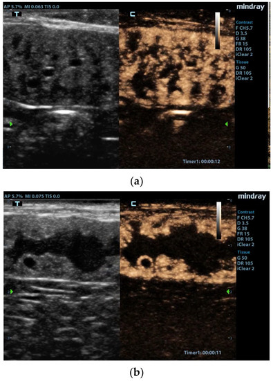 There are hundreds of studies, including papers, reviews, and meta-analyses dealing with the application of CEUS in the diagnosis of breast tumors in women, which is one of the most diffuse oncological pathologies worldwide [92,93,94,95,96,97,98,99,100].