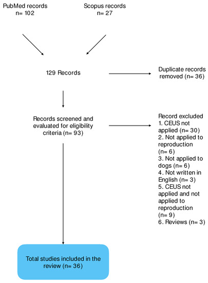 Eligibility criteria were works published in indexed journals between 1990 and 2022 and written in the English language, including studies that dealt with the use of CEUS in at least one of the following areas: testis, prostate, ovary, uterus, breasts. Duplicates of the same article, works that did not concern dogs, and articles that concerned the use of CEUS or applied it in organs or systems different from the reproductive ones were excluded. Reviews were also excluded, since these types of papers do not deal with the direct application of this diagnostic technique and report indirect data from other authors (Table 3).