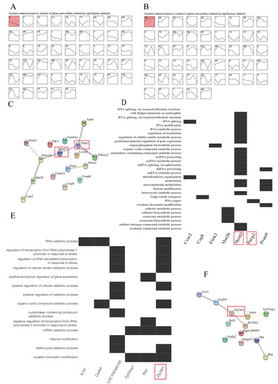 To explore functions of the significant clustered genes identified via STEM analysis, we performed protein–protein interaction (PPI) network analysis (STRING, https://string-db.org/ (accessed on 15 February 2023) and a phenome-wide association study (Phe-WAS, https://atlas.ctglab.nl/ (accessed on 6 December 2022). The PPI network was investigated using four types of evidence (experimental, text mining, co-expression, and databases). The Phe-WAS was a study strategy of 3302 human phenotypes designed to discover associations between a particular SNP or gene and a wide range of traits. This strategy has proved to be effective in both recovering previously discovered genotype–phenotype relationships and finding new ones [23,24]. Figure 3C,F is drawn using STRING and Figure 4A–F is drawn using R.