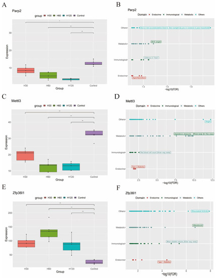 To further annotate the functions of the candidate genes in mammals, we performed Phe-WAS of human orthologs of Parp2, Mettl3, and Zfp36l1 across 3302 human phenotypes (https://atlas.ctglab.nl/ (accessed on 6 December 2022)). The levels of expression of Parp2 and Mettl3 were significantly downregulated in response to heat stress, whereas Zfp36l1 was significantly upregulated (Figure 4A,C,E). Parp2, Mettl3, and Zfp36l1 were significantly associated with immunity, endocrine function, and metabolism (Figure 4B,D,F).