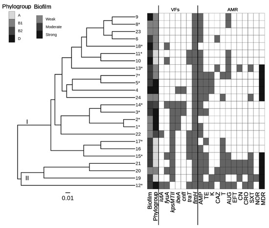 Dendrogram of the 24 E. coli strains based on hierarchical clustering analysis. Clusters are indicated on the tree branches (I and II) and the following features are shown: the ability to form biofilm, the phylogenetic group, the identified VF genes, the AMR profile and whether the strain is MDR. Strains that underwent a broth-enrichment step before isolation are marked with “*”.