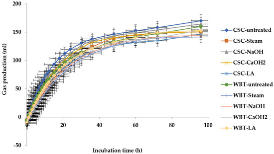 The gas kinetic profiles after 96 h of incubation are shown in Table 3 and Figure 1. Negative values were obtained after fitting the raw data to the model [19] for Y = a + b (1−e(−ct)). There was an interaction effect (p < 0.05) between the source of starch and the starch modification methods in the immediately soluble fraction (a) and the degradation rate constants for the insoluble fraction (c). The WBT treated with the steam process showed lower (p < 0.05) than the other groups on the immediately soluble fraction (a). In addition, the results showed that the degradation rate constants for the insoluble fraction (c) in the untreated CSC were significantly higher (p < 0.05) than those of the other groups. However, there were no interaction effects on the insoluble fraction of gas production (b) or the potential extent of gas production (|a| + b). The steam method showed greater values of b and |a| + b with 164.00 and 172.42 mL/0.5 g DM, respectively. Furthermore, the cumulative gas production was higher in the untreated group (p < 0.01) than in the other groups.