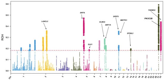 2.5. Identification of Candidate Genes within ROH Islands