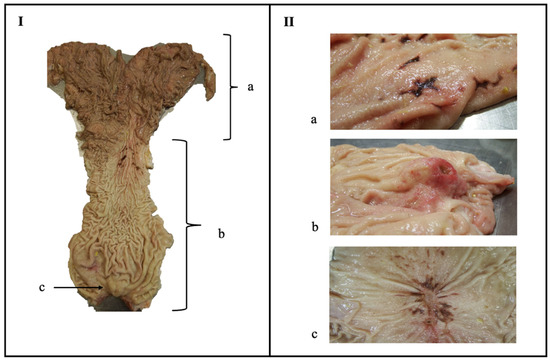 (I): Abomasum of a veal calf, separated as the fundus or fundic area (a), the pyloric area (b), and the torus pyloricus (c). (II): Types of lesions, classified as an erosion (a), ulcer (b), or scar (c).