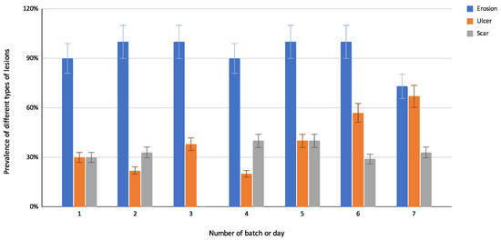 Prevalence (%) of different types of macroscopical lesions (erosion, ulcer, and scar) in 76 abomasa of veal calves in Quebec, separated per day or batch (from 1 to 7).