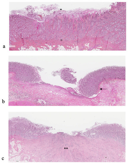 Histological presentation of (a) an erosion, (b) ulcer, and (c) scar in abomasa of veal calves. Only the mucosa (*) is damaged with erosions, in comparison with ulcers and scars where the lamina muscularis mucosae is penetrated (arrow). Additionally, in scars, an excessive amount of granular tissue (**) is found.